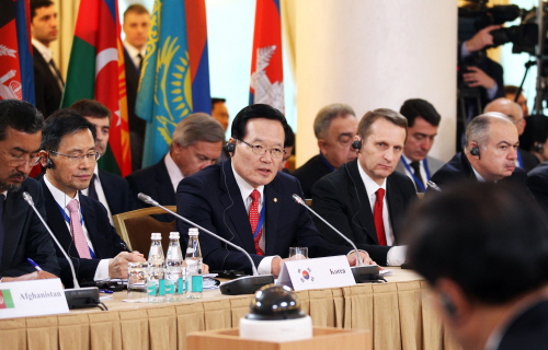 정 의장은 개회사를 통해 “러시아의 찬란한 역사를 상징하는 모스크바에서 ‘21세기 유라시아 국가의 공동 번영을 위한 의회 간 협력’이라는 주제로 제1차 유라시아 국회의장 회의를 개최하게 된 것을 대단히 기쁘고 뜻 깊게 생각한다“면서 ”유라시아 국회의장 회의의 희망찬 출범을 위해 함께 해주신 각국 대표단 여러분께 깊은 감사의 말씀을 드린다“고 인사말을 했다.