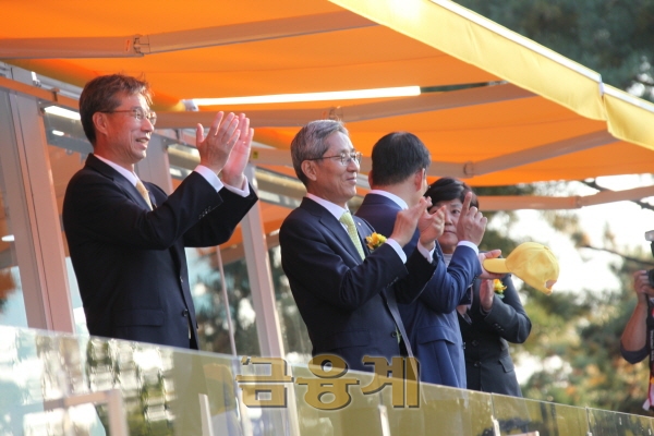 KB금융그룹 윤종규회장과 허인 은행장이 'KB금융스타챔피언십'에서 선수들 경기를 관람하며 박수를 치고있다.2018.10.21KB금융그룹 윤종규회장과 허인 은행장이 경기도 이천의 블랙스톤골프장에서 열린 한국여자프로골프(KLPGA)투어 2018시즌 마지막 메이저 'KB금융스타챔피언십'에 참석했다.