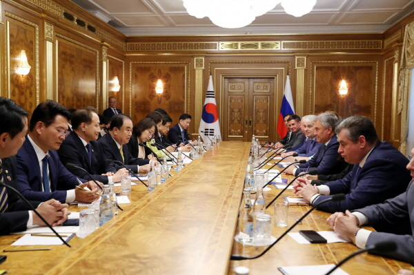 이어 문 의장은 “북한의 완전한 비핵화와 한반도 평화 정착을 위해 지금까지 러시아가 노력해준 것 이상으로 앞으로도 계속 노력해주실 것을 부탁한다”고 당부했다.