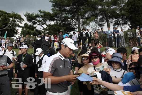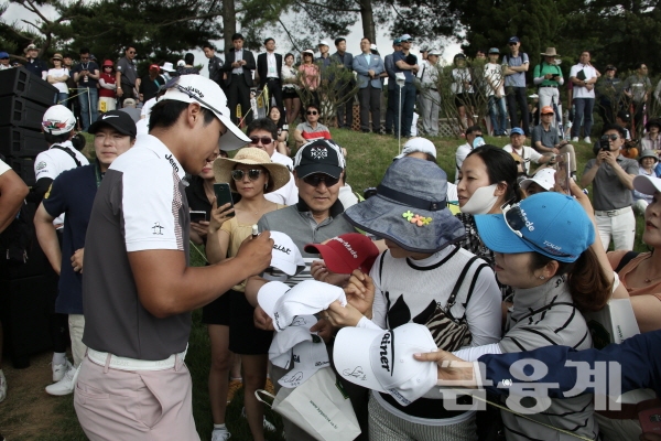 서요섭은 16일 경기 용인시 소재 88컨트리클럽 서코스(파71. 6,987야드)에서 열린 KEB하나은행 인비테이셔널 최종라운드에서 13언더파로 우승을 확정하고 챔피온조 마지막18홀 라운딩을 보며 경기장을 찾은 갤러리들에게 사인을 하고있다.