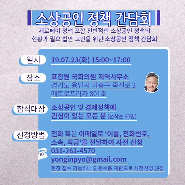 표창원 의원에 따르면 이번 간담회는 용인시의 소상공 실태, 개선방안, 향후 정부정책 방향 등을 다각도로 검토하기 위해 기획됐다.