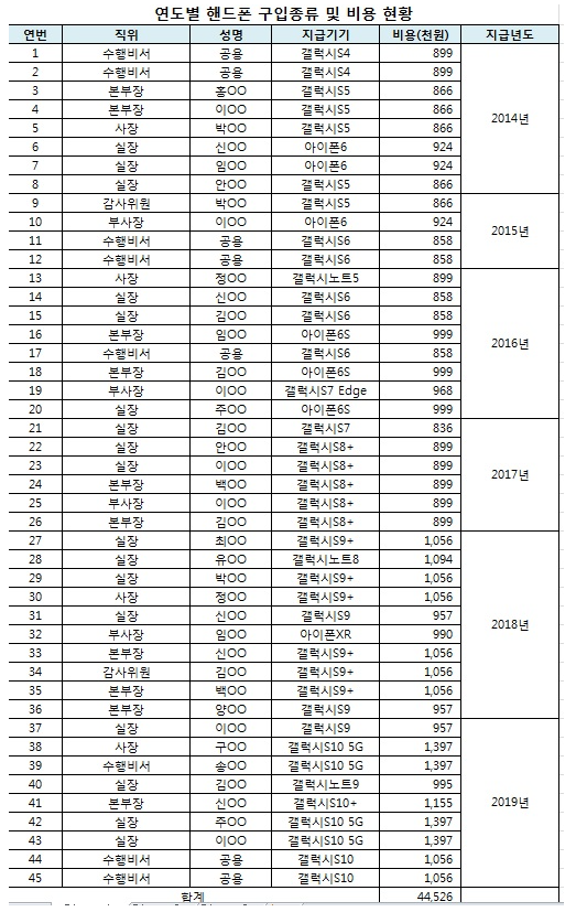 또한 같은 기간 동안 이들 임직원의 핸드폰 요금을 대납한 금액은 ‘14년 2183만원, ‘15년 2180만원, ‘16년 1900만원, ‘17년 1854만원, ‘18년 1953만원, 올해(9월말 기준) 1779만원으로 최근 5년 9개월간 1억 1849만원인 것으로 확인됐다. 현재 기준 공사가 핸드폰 요금을 대납해주고 있는 임직원은 「사장, 부사장, 본부장(4명), 감사위원, 홍보실장 등 실장(6명)」 등이다.
