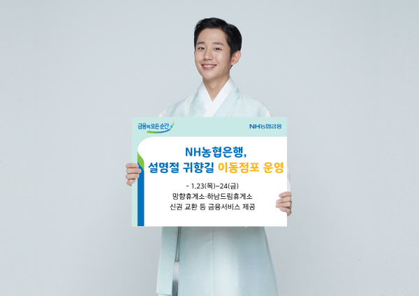 [청년투데이=이청년 기자] NH농협은행(은행장 이대훈)은 설명절 기간 고향을 방문하는 고객의금융편의를 위하여 오는 1월 23(목)~24(금)에 경부고속도로 부산방향 망향휴게소와 중부고속도로 하남드림휴게소에서 오전 9시부터 오후 4시까지 이동점포를 운영한다고 지난 17일 밝혔다.