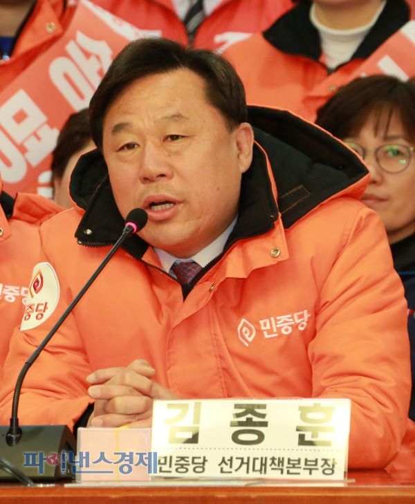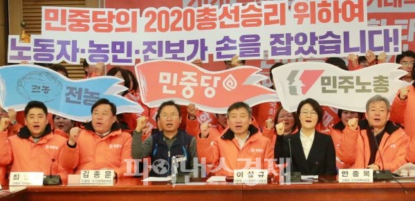 [청년투데이=김원혁 기자] 민중당 선거대책위원회 이상규 민중당 상임선거대책위원장, 김명환 민주노총 위원장을 비롯한 참석자들이 3일 서울 여의도 국회 의원회관에서 열린 민중당 선거대책위원회 출범 기자회견에서 승리를 위한 구호를 외치고 있다. 2020.02.03.