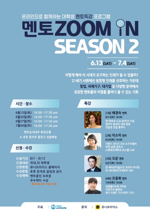 [청년투데이=김선근 기자]오늘의 리더와 내일의 리더의 만남을 주선하는 대학생 사회공헌단체 '유니브리더스'는 온라인 멘토 특강 프로그램, '멘토 ZOOM IN' 시즌 2를 4주간(6월 13일~7월 4일)운영한다.