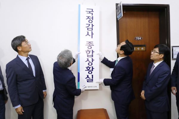 국회사무처는 내실있는 국정감사를 지원하기 위해 10월 2일부터 위원회별 감사 진행상황을 종합·보고하는 「국정감사 종합상황실」을 국회 본청 704호실에 운영할 예정으로 9. 27(금) 10시 유인태 사무총장 주재로 현판식을 실시하였다(사진첨부).