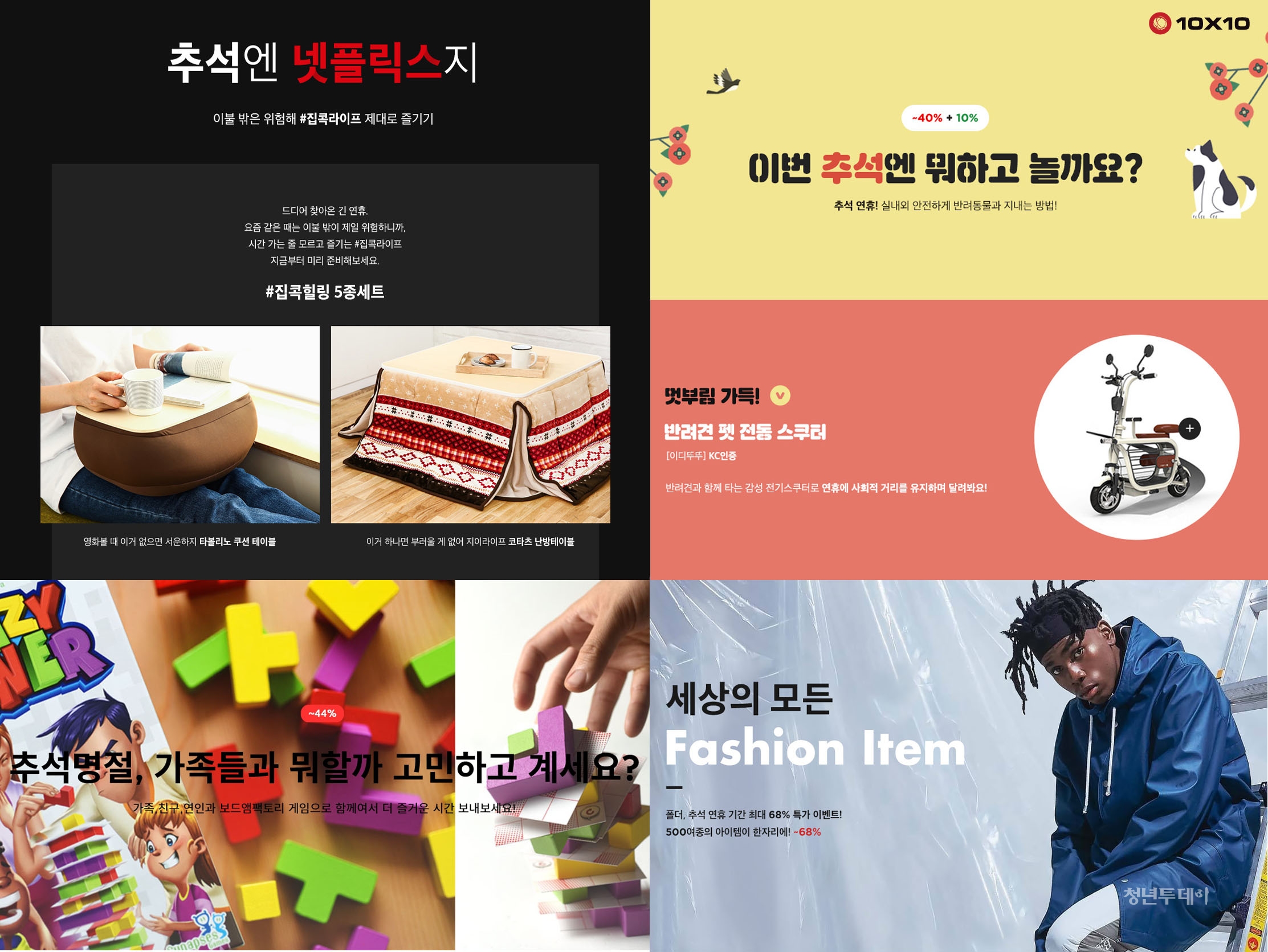 텐바이텐 관계자는 “집에서 어떻게 추석을 보낼지 고민인 이들이 많아지면서 관련 상품들의 판매가 늘고 있다”며, “리빙용품부터 취미용품과 반려동물 용품 등 홈추족들의 다양한 유형에 따라 여러가지 기획전을 진행하고 있다”고 밝혔다.