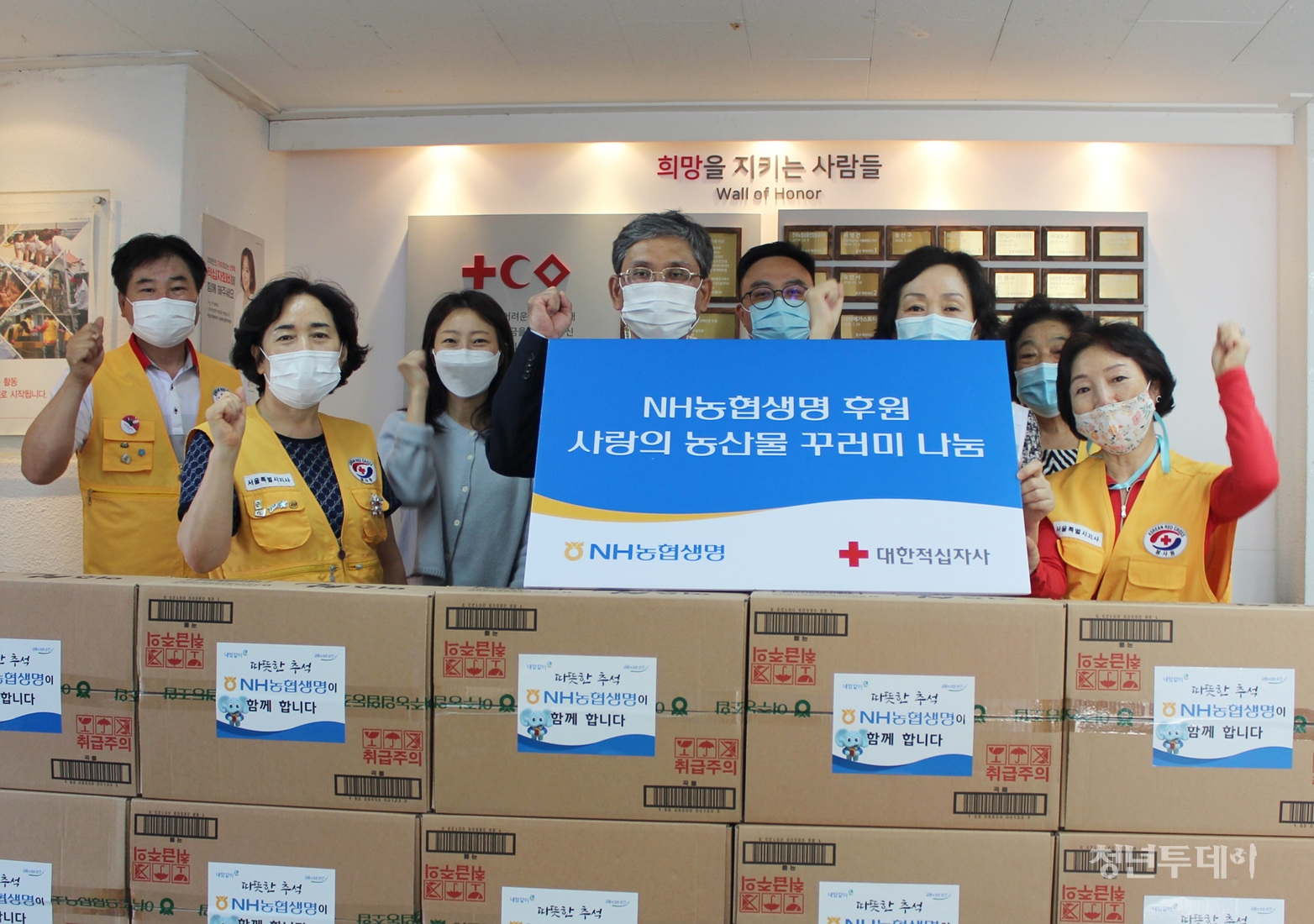 [청년투데이=안현준 기자 NH농협생명이 대한적십자사 서울특별시지사에 취약계층에 전달할 사랑의 농산물 꾸러미를 전달했다.