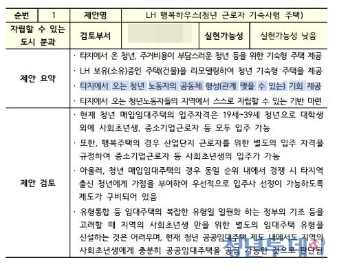 [청년투데이=아이즈팀 김수지, 이건우, 박윤아 기자] 한국토지주택공사(LH) 청년위원회가 제시했던 청년 근로자 기숙사형 주택이 실현 가능성이 어려운 것으로 알려졌다.