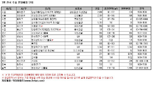 주택건설업계에 따르면 7월 분양 예정 아파트(주상복합 포함)는 전국 27곳 8천5백59가구이며 이는 지난 2009년 8월(8천4백82가구)이후 가장 적은 물량이다.
