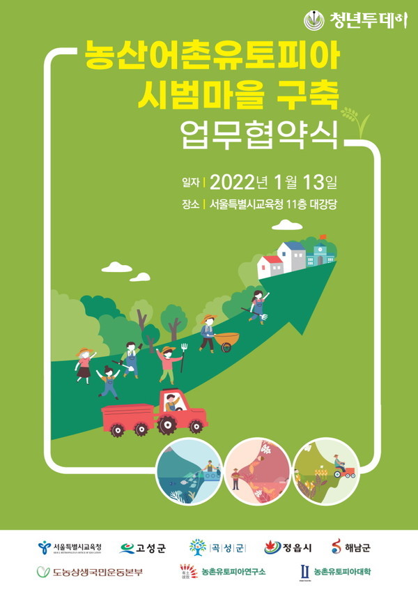 그 일환으로 서울시교육청은 13일 경남 고성군, 전남 곡성군, 전남 해남군, 전북 정읍시 및 도농상생국민운동본부, 농촌유토피아연구소, 농촌유토피아대학와 농산어촌유토피아 시범마을 구축을 위한 업무협약을 맺는다.