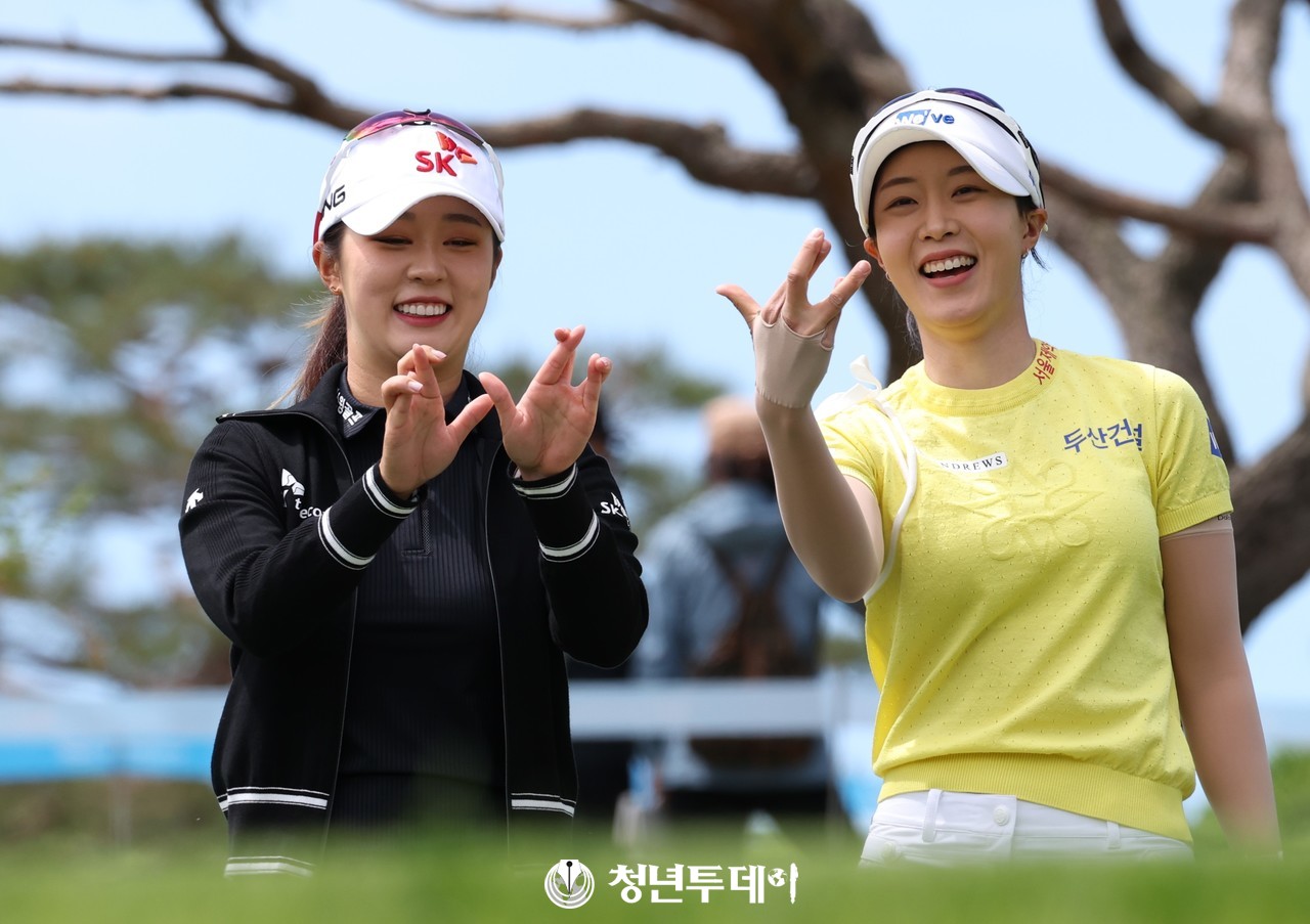 김재희 와 유효주가 대회 이틀째인 16일 10번 홀에서 드라이버 티샷을 마치소 손으로 하트를 만들고있다.