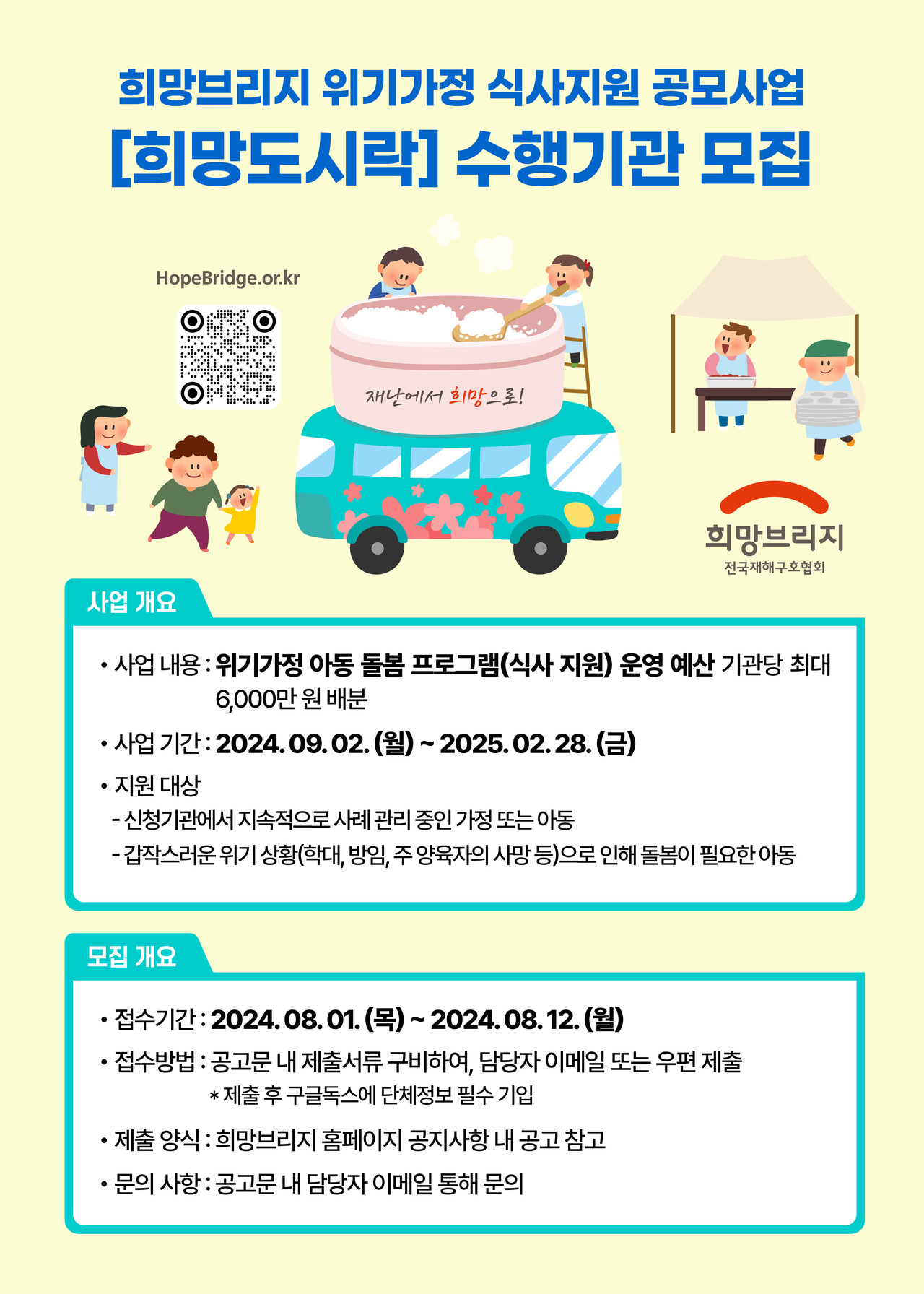 [청년투데이=김원혁 기자] 희망브리지 전국재해구호협회(회장 송필호)는 위기가정 아동들의 건강한 신체 성장과 정서 발달을 위하여 영양가 있는 식사 및 돌봄 프로그램을 지원하는 ‘희망도시락’사업을 수행할 기관·단체를 모집한다고 25일 밝혔다.