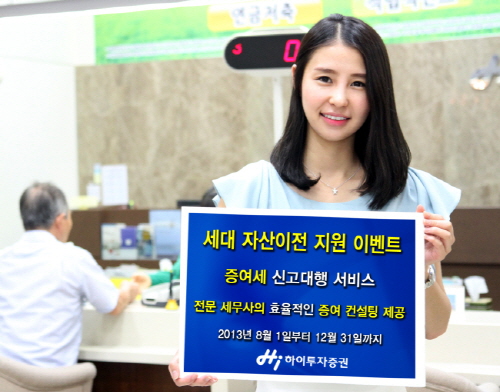 세대 자산이전 지원 프로모션은 사전 증여를 고민하는 투자자가 하이투자증권 제휴 세무사와의 상담을 통해 효율적인 증여 컨설팅을 제공받고, 하이투자증권에서 판매하는 금융상품으로 실제 증여처리가 이루어지면 무료로 증여세 신고대행을 해주는 서비스다. 1억원 이상 증여세 신고대행 고객에게는 소정의 상품권도 함께 제공한다.